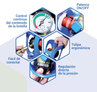 Con la válvula ergonómica MINITOP™, no necesitará comprar ni reemplazar su regulador original, el regulador está directamente integrado en la botella. Air Liquide también le ofrece un servicio de mantenimiento. La conexión del flexible es muy sencilla.
